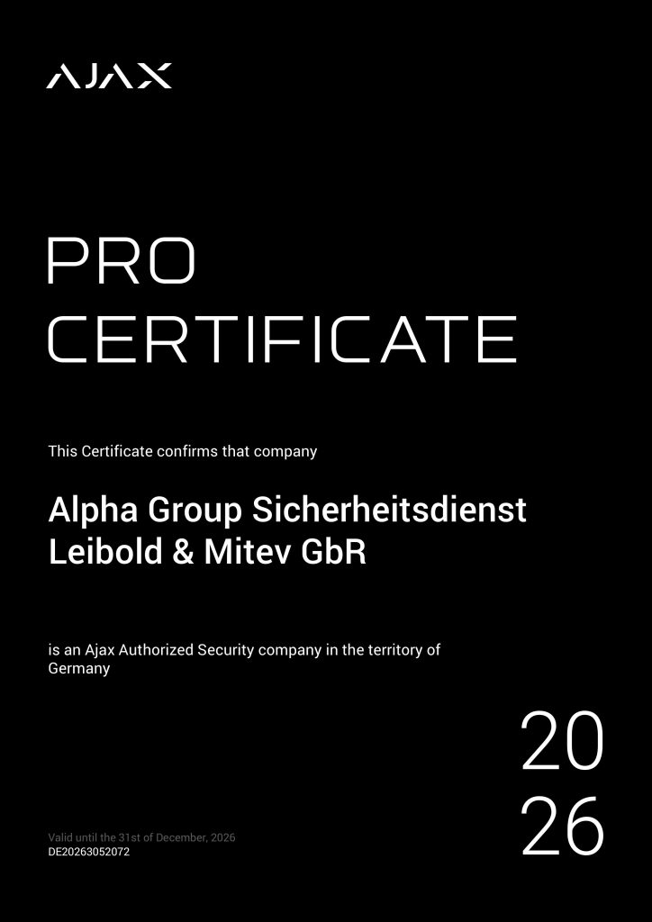 Die Alpha Group Sicherheitsdienst Leibold & Mitev GbR ist ein zertifiziertes „Ajax Authorized Security“ Unternehmen für Deutschland.